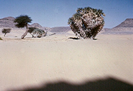 Northwest wadi of Kurkur Oasis (left). The date palm in which the hawk died (right).
