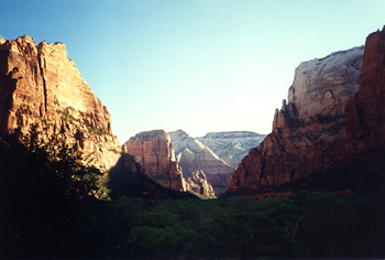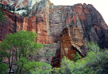 Today, however, the Virgin River is cutting Zion Canyon through that solid layer of resistant Navajo Sandstone. As it does so, the walls of the canyon relax and expand ever so slightly toward this opening, which causes cracks to form that run parallel to the canyon about fifteen to thirty feet inside its mighty walls.