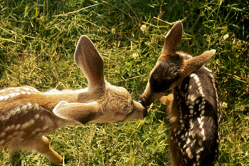 As the doe started feeding, her fawn discovered the moonbeam. With head outstretched and nostrils flaring, it approached the light--its legs stiff and tucked well beneath its body for instant flight. The youngster "snorted" suddenly and fled to its mother, whose head snaped erect at the sound. The fawn nursed, and its mother returned to eating.