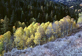Quaking aspens in Autumn yellow, which caused one area to become known as "Butter Hill."