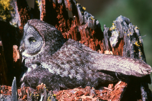 Great gray owl on its nest in the rotting top of an old tree. Photograph courtesy of Ralph Anderson, USDA Forest Service.