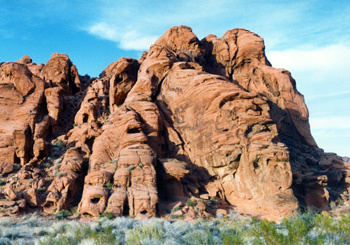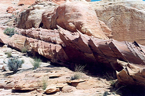 The Rocks Of Today: The magnificent rock formations in the Valley today have been created largely by the fracturing of the Aztec Sandstone. Although some fractures are a result of movement within the Earth, others in the old, brittle sand dunes are not. Instead, the vertical faces in many of the cliffs result from the collapse of sandstone blocks along vertical cracks as that last grain of sand gave way to the pull of gravity.