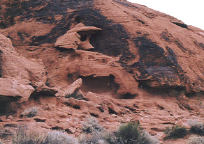 The surfaces of some rock faces are coated with a black substance called "desert varnish," which is a result of chemical action. Leached from the rock, iron and manganese are deposited on the rock's surface as water emerges and evaporates over thousands of years, and is perhaps modified by microscopic plants. These blackened surfaces were favored by the Valley's first inhabitants as ideal sites to carve picture writing.
