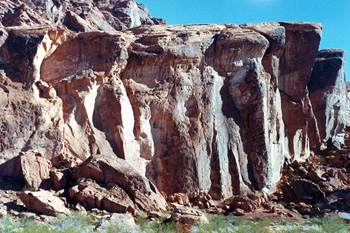 Beginning about 14O million years ago, mud and sand took over from the sea and reigned nearly 75 million years, during which time the Valley's limestone was covered to a depth of about 4,5OO feet. Carried by winds from the erosion of distant highlands, masses of lofty, shifting dunes--sometimes thousands of feet high--piled up in the Valley. Over time, the grains of sand became cemented together with iron to form "fossil" dunes (called Aztec Sandstone) almost a half-mile thick.