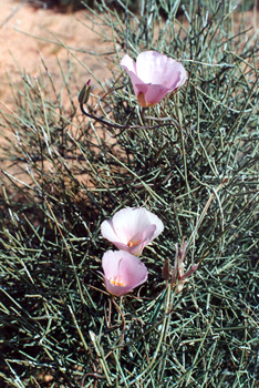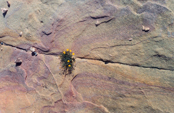 With the birth of Spring comes the bright green of new grasses and the delicate hues of desert flowers that smile at us briefly and are gone: the yellows of mustard, desert gold, and evening primrose; the lavender and pink of sego lilies; the whites and blues of desert poppy and astragalus; the oranges of desert mallow and California poppy; and the hot-pink of beaver-tailed cactus. Everywhere life is bursting--from the songs of birds and the whining and buzzing of insects to the seemingly timeless miniature gardens of gray, lavender, orange, yellow, and chartreuse lichens that grow almost imperceptibly over the centuries to cover the rocks with a splendid array of brilliant color.