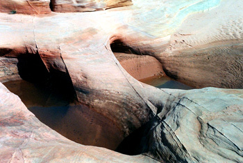 Occasional Spring rains fill the long-empty stream channels with rushing torrents that are here and gone in a wink and in their passing soften the soil with moisture. Despite the water's hurry, potholes in the channels' rocks hold water for a time in quiet pools, a reprieve from the drying winds of a thirsty land. Here, in the magic of the moment, we cool our feet after a long day's walk over sand and rock. Here, too, are strange little flies resting on the water's surface only to be blown hither and yon by playful breezes that murmur of days gone by, of today, and of days yet to come as they waltz over the desert floor creating swirls of dust in their passing.