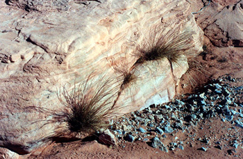 Because the sandstone was cemented together one grain at a time, it's not surprising that it is dissolving the same way. Today, grains of sand, released from their millennial bondage, once again blow across the desert, forming little dunes.