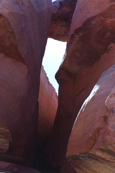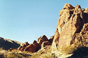 Zane and I Enter The Valley: Zane and I first see the Valley of Fire in May 199O, and we are instantly captivated by some mystical sense that seems to emanate from the rocks, an ancient remembering hanging like a cloak in the air. Is it the endlessness of forgotten time or that the spirits of olden days still wander the Valley, their voices whispering in the desert wind? It's nothing we can explain or define, but over the next two years we are drawn repeatedly to the Valley. And always the Valley offers us a sense of ancient spirits gathered to share our little secretive fires amidst the boulders fallen from the long red mountain of Aztec Sandstone, which looks like a dinosaur's naked spine protruding above the surrounding desert's floor.