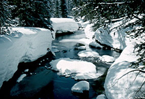 Snowpack in the Alps near Melchsee, Switzerland, on the 24th of May, 1985. Aside from glacial ice, the annual accumulation of snow (snowpack) can, under good conditions, last as snowbanks late into the summer or even early autumn. How much water the annual snowpack has and how long the snowpack lasts depends on six things: (1) the timing, duration, and persistence of the snowfall in any given year; (2) how much snow accumulates during a given winter; (3) the moisture content of the snow—wet snow holds more moisture than dry snow; (4) where the snowfall accumulates in relation to shade and cool temperatures in spring and summer, e.g., under the cover of trees and on north-facing slopes versus in the open and south-facing slopes with no protective shade; (5) when the snow begins melting and the speed at which it melts—the later in the year it begins melting and the slower it melts, the longer into the summer its moisture is stored above and below ground; and (6) the health of the overall water catchment. Although the first five points seem self-evident, the last one requires some explanation. In dealing with the health of water catchments, one must consider those of both high and low elevation. How we treat our high-elevation forests (and those at more northerly latitudes) is how we treat a major portion of the most important sources of our supply of potentially available water—the purity and longevity of the snow and ice.