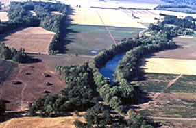 A farmer is clearing the riverside forest—the dark area with piles of debris—because it is viewed as "non-productive" unless it is farmed, despite its intrinsic value to the health of the stream (left). Farming right up to the edge of a stream or river guarantees that much of the non-point-source pollution from agriculture will go directly into the nation's waterways (right).