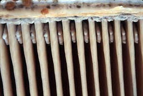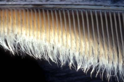 As you can see, these whales have a virtual sieve in their mouths, called "baleen." As the whales swim through plankton-rich waters, they take in great mouthfuls of wee, freely floating plants and animals. Then, by pushing their huge tongues upward against the roof of their mouths, they literally stain out the plankton though the baleen sieve (which you can see in the upper jaw--left side of the photograph of the whale's mouth). Now, if you look at the photographs of the baleen, especially the lower one, you see the source of corset stays in times past.